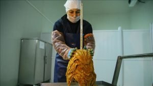 وتابعت: ” يتم إجراء عمليات التتبيل وإضافة البهارات، بعد تثبيت الأسماك على سيخ الدونر “.