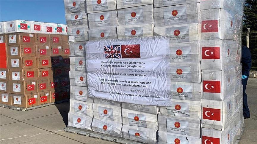 والجمعة، أرسلت تركيا مساعدات طبية إلى بريطانيا لدعمها في مواجهة جائحة كورونا، حيث هبطت طائرة شحن عسكرية تركية في العاصمة لندن محملة بمستلزمات طبية.