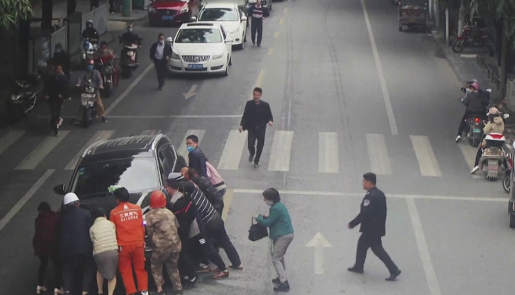 بث التلفزيون الصيني فيديو لحادث مروري سجلته كاميرات في مدينة هيشي حيث دهست سيارة دفع رباعي اثنين من المارة أثناء عبورهما الطريق وسحبت إحداهما وهي امرأة لعدة أمتار.