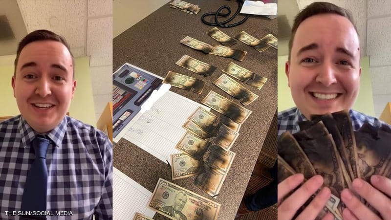 ورفع ديكر مجموعة من الدولارات أمام كاميرا الهاتف الذكي وقد بدت بالفعل مسودة ومحترقة، وأظهرت اللقطات دولارات محترقة من فئة الدولار الواحد والخمسة دولارات والعشرين دولارا، بحسب ما ذكرت صحيفة الصن البريطانية.