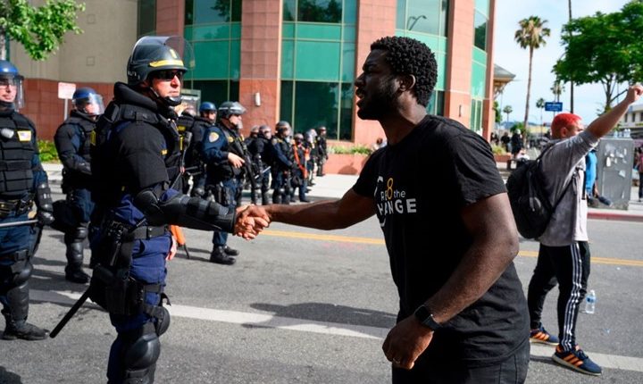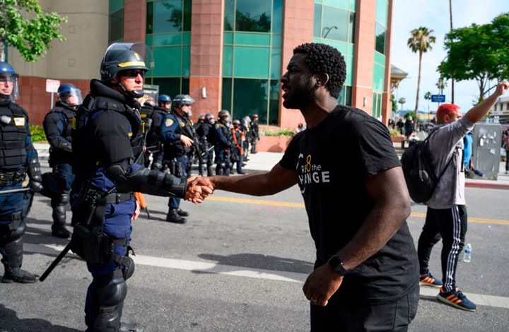 نشرت وسائل إعلام أمريكية فيديو يظهر عناصر من شرطة ولاية لوس أنجلوس وهم يتضامنون بشكل مثير مع احتجاجات السود على مقتل جورج فلويد.