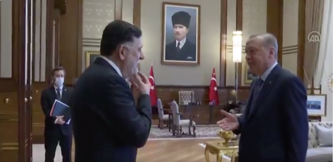 ووثقت القطات حديثا خاطفا بين الطرفين قبيل اجتماعهما، يظهر فيها أردوغان وهو يشير إلى لحية السراج معلقا عليها بالقول “بارك الله”.