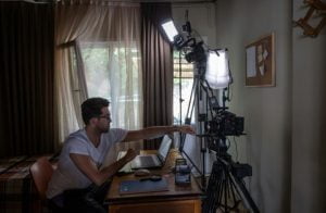 وفي موقع التصوير، يصحح الفنيون بملابسهم الواقية وضعية الكاميرا ويجرون عمليات الضبط اللازمة قبل الانسحاب إلى حجرة يسيّرون فيها العمل عن بعد.