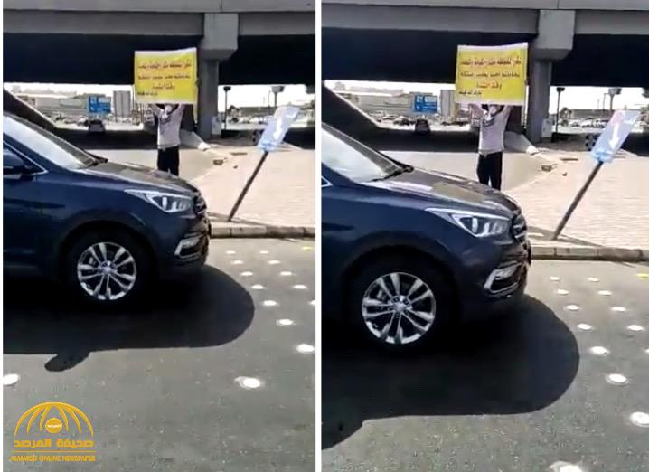 فيديو | مقيم يحمل لافتة تحت أشعة الشمس مدونًا عليها رسالة شكر وعرفان للمملكة وللشعب السعودي.