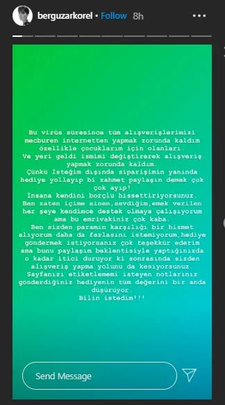 ونشرت الفنانة التركية منشوراً مطولا عبر خاصية “الستوري” في حسابها على إنستغرام، أكدت في على أن ما تقوم به تلك الشركات “عيباً” كبيراً، إذ قالت فيه: “خلال فترة الحجر المنزلي بسبب تفشي كورونا، اضطررت إلى إجراء جميع مشترياتي عبر الإنترنت، وخاصةً تلك المتعلقة بأطفالي..ولكنني اضطررت إلى التسوق من خلال تغيير اسمي، لأنه كان من العيب جدًا أن تقوم تلك الشركات بإرسال طلباتي على أنها هدية وبجوارها مكتوب نرجو المشاركة عبر حسابك”.