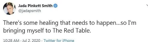 وتعهدت جادا، البالغة من العمر 48 عامًا على “تويتر” أنها ستكشف الحقيقة والادعاءات المتفجرة في سلسلة Red Table Talk، حيث وصفت الأمر بـ “الإلتئام الذي يجب أن يحدث، لذلك سأتحدث في Red Table Talk برنامج حواري تلفزيوني أمريكي على شبكة الإنترنت”.