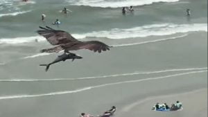 ويظهر الفيديو، الذي أفادت CBS أنه تم تصويره من قبل آشلي وايت من ولاية تينيسي الأسبوع الماضي، وشاركه حساب Tracking Sharks على “تويتر”، ما يبدو أنه طائر كبير يشبه الصقر يطير فوق شاطئ ميرتل بيتش في كاليفورنيا حاملا سمكة كبيرة تكافح من أجل التحرر من مخالبه.
