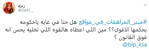 واستدعت مغردة تُدعى “ريري” حساب النيابة العامة السعودية مستعينة ببعض من التغريدات المسيئة التي دونها هذا الحساب سابقًا بشأن الصور التي يعدها “عارية” من وجهة نظره وتنشرها الفتيات في حساباتها، وكتبت قائلًة في تغريدتها: “#مبتز_المراهقات_في_مواقع هل حنا في غابه ياحكومه يحكمها الأقوى؟؟ مين اللي اعطاه هالقوه اللي تخليه يحس أنه فوق القانون؟”.