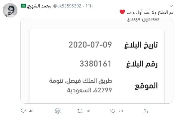 وانهالت الكثير من التعليقات على تغريدة هذا “المبتز” كما أطلق عليه المتابعين، ومن بين التعليقات كتب مواطن يُدعى محمد الشهري أنه قدّم أول بلاغ ضده في جهة الدوريات مرفِقًا بالبلاغ التغريدة التي نشرها “المبتز”، وحمل البلاغ رقم 3380161 وتم اتهامه بنشر صور نساء سعوديات في مواقع إباحية.