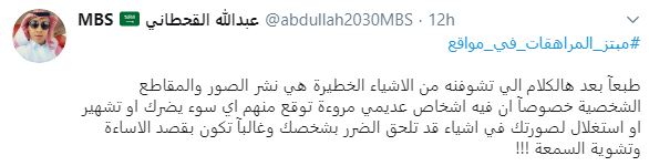 وجاء في تغريدته: “#مبتز_المراهقات_في_مواقع طبعًا بعد هالكلام اللي تشوفنه من الأشياء الخطيرة هي نشر الصور والمقاطع الشخصية خصوصًا إن في أشخاص عديمي مروءة توقع منهم أي سوء يضرك أو تشهير أو استغلال لصورتك في أشياء قد تلحق الضرر بشخصك وغالبًا تكون بقصد الاساءة وتشويه السمعة!”.