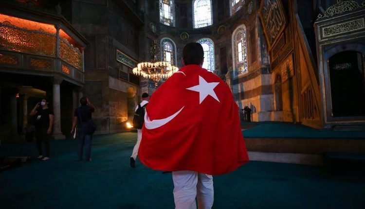 وتوافد المواطنون الأتراك منذ فجر الجمعة، بأعداد كبيرة نحو ساحة مسجد “آيا صوفيا” للمشاركة في الصلاة.