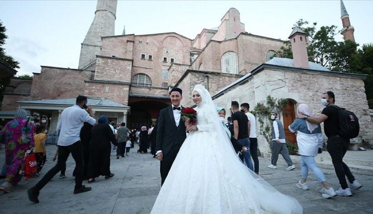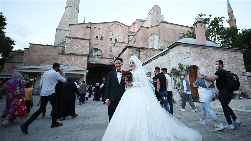 استقبل مسجد آيا صوفيا الكبير بمدينة إسطنبول، السبت، عروسين أجنبيين أرادا تخليد ارتباطهما بالتقاط صور تذكارية، بعد يوم من إعادة فتحه للعبادة.