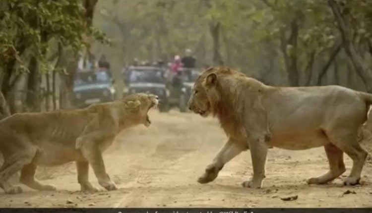 وأظهر المقطع المصور، اللبؤة تزأر في وجه الأسد وتحاول صفعه على وجهه، بينما يحاول الأسد تجنبها وعبور الطريق غير آبه بها.