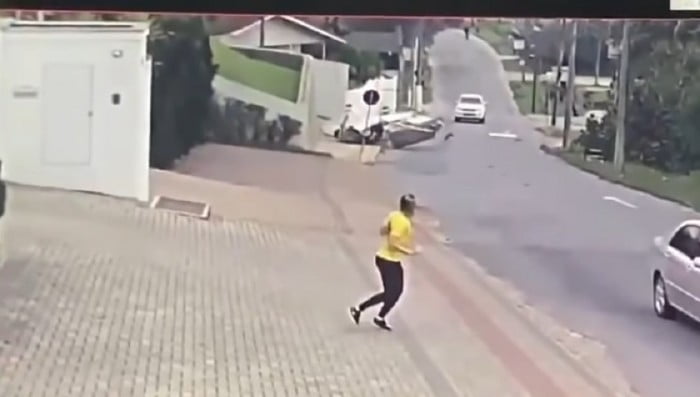 انتشر على مواقع التواصل الاجتماعي في البرازيل والعالم فيديو لطائرة صغيرة تندفع فوق طريق عام، ينتهي بها المطاف لتصطدم بالرصيف متسببة بالذعر لشابة كانت تسير وحيدة في الشارع.