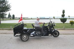 قام المتقاعد التركي عبد الله إينسير (59 عاما) بتعديل دراجته النارية ذات العجلات الثلاث بقطع غيار السيارات ليجعل منها دراجة نارية فارهة تجلب أنظار المارة والسائقين.
