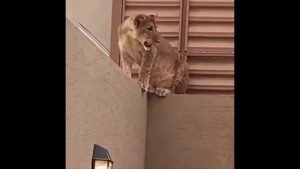 فاجأ أسد عائلة سعودية بظهوره على سور المنزل لدى قيامها بذبح أضحية عيد الأضحى.