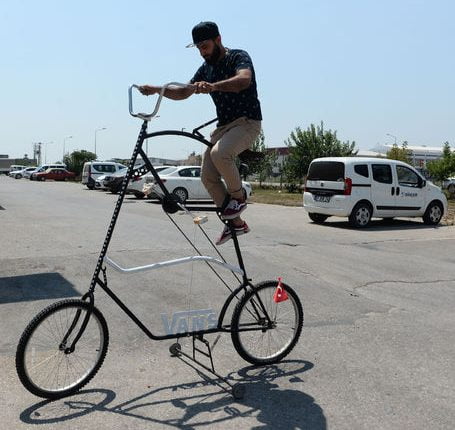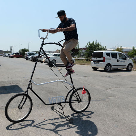 وقد أضاف دمير سلما لركوب الدراجة التي يصل ارتفاعها إلى 3 أمتار، وأرجل إضافية للتوازن في أثناء الوقوف.