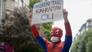 يجوب التركي تامر أويصال، الملقب بالـ”رجل العنكوب” شوارع مدينة أسكي شهر وسط تركيا، لتوزيع كمامات على المارة من أجل لفت الانتباه إلى أهمية الالتزام بتدابير مكافحة فيروس كورونا ونضال الكوادر الطبية في هذا الإطار.