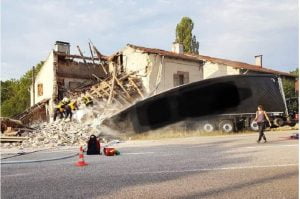واصطدمت الشاحنة التي تزن 38 طنًا بمنزل المرأة، مما أدى إلى سقوط جزء من السقف فوقه. وعلق سائق الشاحنة تحت الأنقاض واضطر طواقم الطوارئ لإنقاذه، وتم إدخاله إلى المستشفى في حالة خطيرة.
