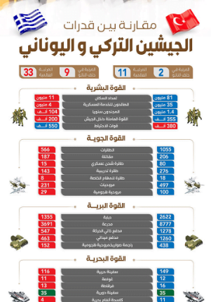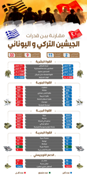 مقارنة بين قدرات الجيشين التركي واليوناني (إنفوغراف)