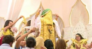 العريس ويرفع الوشاح الأحمر عن وجه عروسه ويبارك لهما”.