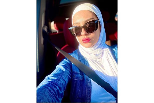 وتظهر الصورة الفنانة وهي مرتدية حجاب سوري، لم يظهر خصلات شعرها، مع نظارة شمسية داخل سيارتها.
