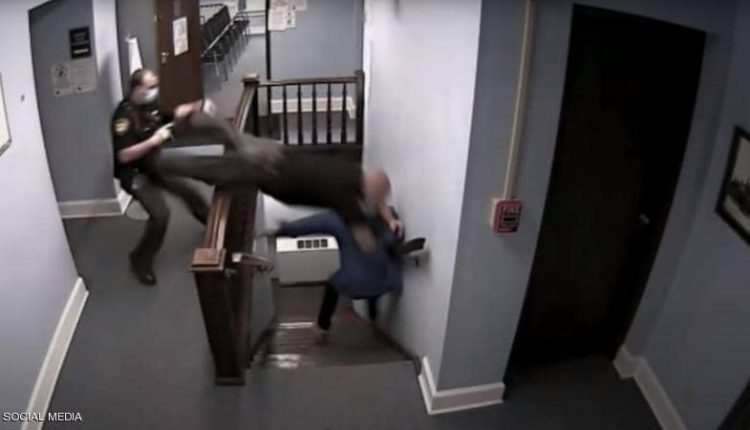 وخلال وصوله إلى الدرج، حاول شرطي القفز بطريقة انتحارية على الهارب لقطع الطريق عليه، لكنه فشل في عمليته وتدحرج