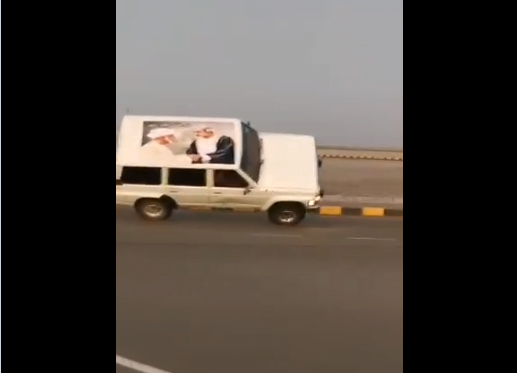 وقد تبين على ظهر السيارة التي يستعرض بها المواطن، صورة للسلطان هيثم بن طارق، وفي جانبه السلطان الراحل “قابوس بن سعيد”.