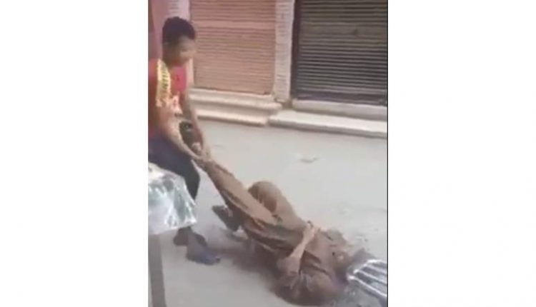 وظهر بالفيديو شاب، يتعدى على الرجل العجوز وسحله على الأرض ويقول له “هتقوم ولا مش هتقوم؟ .. هتتعلم الأدب ولا لأ؟، هموتك؟”.