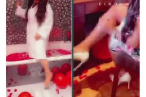 وظهرت الفاشنيستا “س.ك”، وهي تقوم بدهن جسدها بالزيت أمام المرآة للفت الأنظار إليها بالتعري واستعراض مفاتنها.