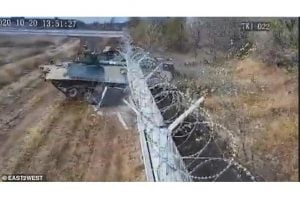 وثق مقطع فيديو، تحطيم جنود روس مخمورين، مدرعة من خلال الاصطدام بجدار من الأسلاك الشائكة في مطار فولجودراد .