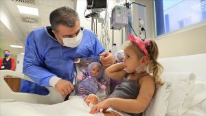 وزار قوجة الطفلة “آيدا” في قسم العناية المركزة، وأحضر لها دمية، واطمأن على صحتها.