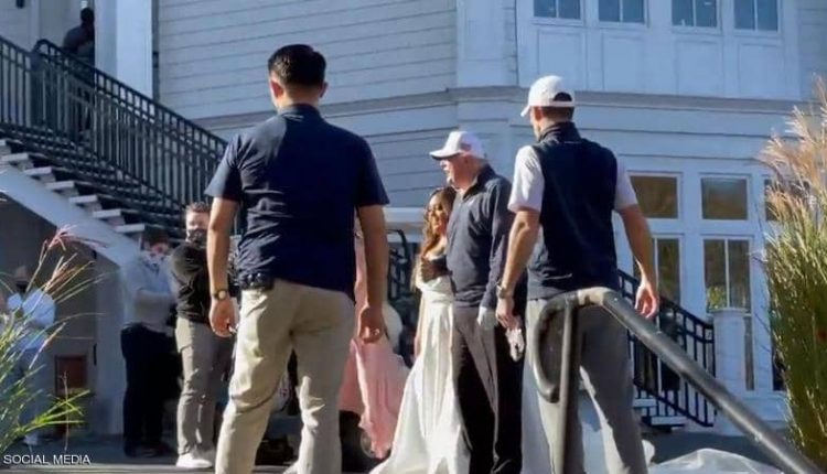 وأظهر مقطع فيديو، منشور على موقع تويتر، ترامب بلباسه الرياضي وهو يلتقط صورا مع العروس وعائلتها، وسط حراسة أمنية مشددة.