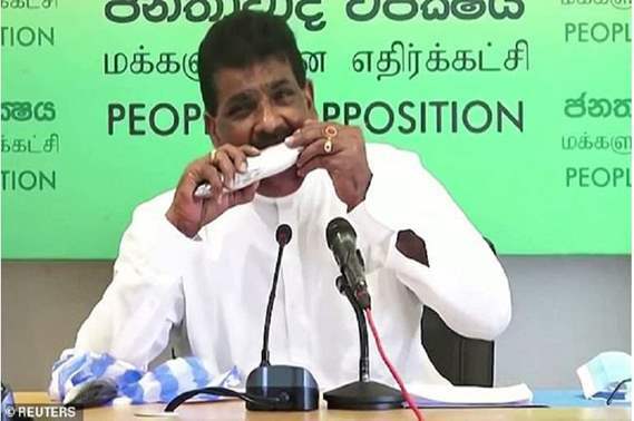 قضم وزيـر سريلانكي سابق، سمكة نيئة كاملة خلال مؤتمر صحفي، من أجل إثبات أنه لن يصيب الناس بفيروس كورونا المستجد.