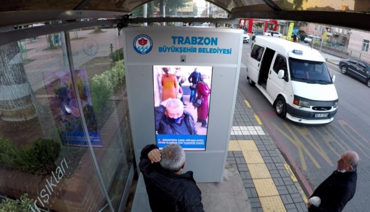 جذب تطبيق الشاشة الرقمية القائم على الذكاء الإصطناعي ،انتباه المواطنين، الذي تم وضعه في محطة الحافلات في طرابزون ، لإلزام المواطنين بتنفيذ إجراءات السلامية ، في ظل إنتشار فيروس كورونا ،حيث يقوم التطبيق على تحويل وجوه المواطنين بدون قناع إلى أيقونة مشابهة لفيروس كورونا عبر برنامج خاص .