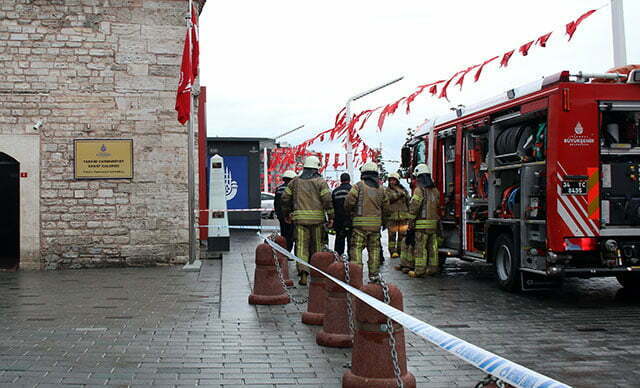 اندلع حريق، يوم الأحد، بسبب تماس كهربائي بمعرض جمهوريت للفنون في ساحة تقسيم بمدينة اسطنبول.