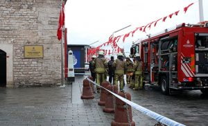 فرق الإطفاء أثناء إخماد حريق المعرض الفني في اسطنبول