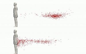 وأظهرت الدراسة اتّباع قطرات الرذاذ الرجل من ارتفاع مستوى الخصر، مع اندفاع تيار الهواء بسبب تحركه في المكان.