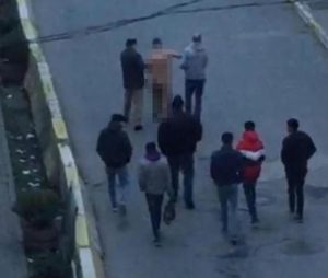 وشوهد رجلان يمسكان شابًا جُرّد تمامًا من ملابسه، ويتجولان في شوارع الحي، بينما قام بعض الأشخاص بتصوير الحدث.