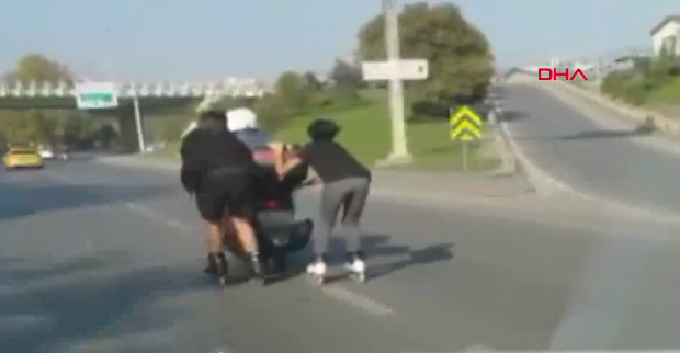 وأظهرت وسائل إعلام، وفق ترجمة موقع “تركيا الآن”، مشهد طفلين يرتديان أحذية التزلج على طريق بيالا باشا في شيشلي بينما كانا يمسكان بدراجة نارية من الخلف، على الطريق السريع.