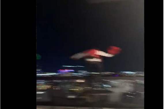 ويظهر فيديو منشور على موقع “تويتر”، الرجلين يتسلقان على السور، ويقفزان بلا مبالاة، وسط صيحات امرأة: “يا إلهي. يا إلهي،يا إلهي. يا إلهي”. بينما يستعد الاثنان للنزول.