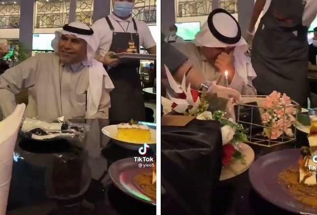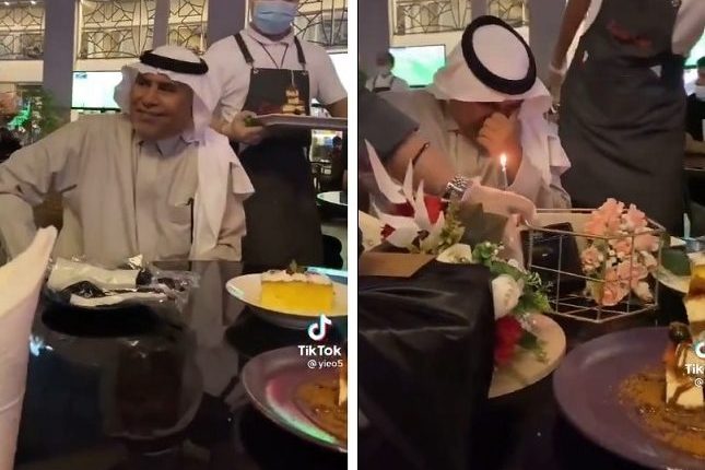 ويظهر الأب بالفيديو يجلس مع بناته في أحد المطاعم، ثم يتفاجأ بوصول كيكة عيد الميلاد ومجموعة هدايا بطريقة مميزة، ما جعل الأب يبكي من شدة التأثر.