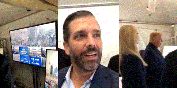 ثم يحث دونالد جونيور أنصار والده على “القتال”. قبل أن ينقل الهاتف لإظهار والده وشقيقته يتحدثان إلى شخصيات بارزة في البيت الأبيض. بينما تعرض العديد من الشاشات التلفزيونية لقطات إخبارية لمؤيديهم وهم يسيرون نحو مبنى الكابيتول.