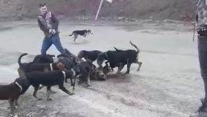 ولم يكتفِ الصيادون بتقييد رجلي الكلب الخلفيتين، بل قدموه لكلاب الصيد الذين رافقوهم في رحلتهم.