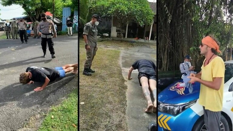 عاقبت شرطة جزيرة بالي السياحية الإندونيسية أجانب كانوا يتجولون دون كمامة، بإجبارهم على ممارسة تمارين ضغط.