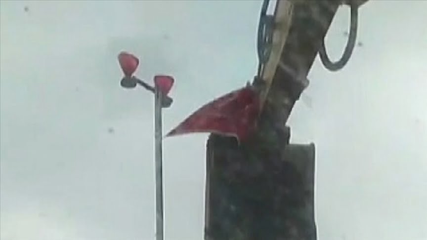 وأظهر مقطع فيديو، تابعته موقع “تركيا الآن”، استخدام المواطن يسار إغيردير رافعة لمنع سقوط علم تركيا كان على وشك السقوط بفعل الرياح.