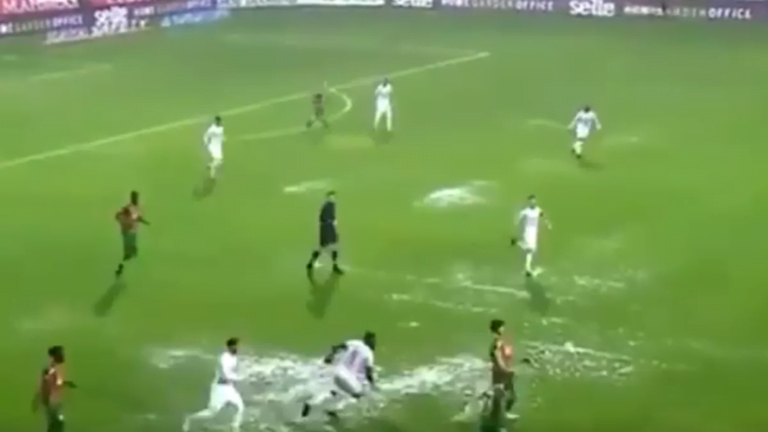 وتوقفت المباراة قبل أن يتم تأجيلها لوقت لاحق بسبب الظروف الجوية غير المناسبة. وعجز اللاعبون عن تحقيق أي هجمة متكاملة على أرض الملعب التي غصت بمياه الأمطار. فكانت الكرة تعلق في عشب الميدان لتتوقف فجأة عن الحراك.