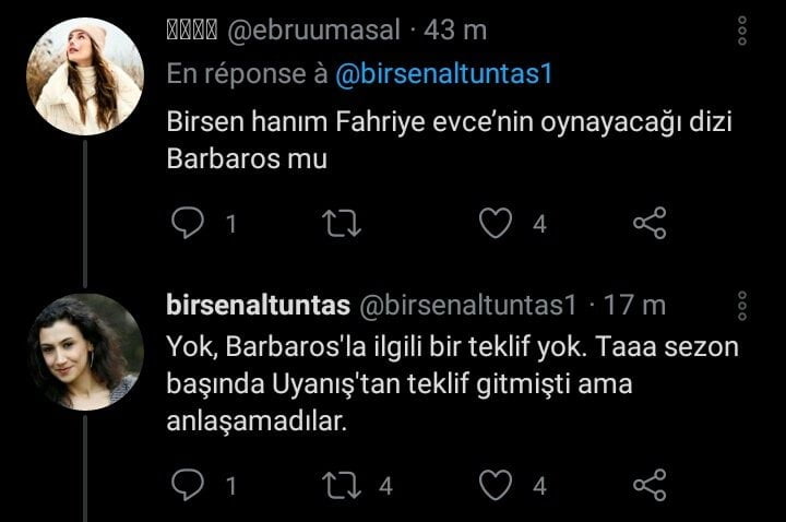 وفي التفاصيل، فقد قامت إحدى المتابعات بسؤال الصحفية عبر حسابها الرسمي على تويتر حول ما إذا كانت الأنباء الواردة عن اتفاق فهرية مع صُنّاع مسلسل “بربروس” صحيحة أم لا، لتجيب بيرسين بأنَّ الأمر غير صحيح، قائلةً: “لا، لا يوجد عرض متعلق ببربروس..في بداية الموسم، جاء عرض لها من مسلسل “نهضة السلاجقة” ولكن لم يتفقوا”.
