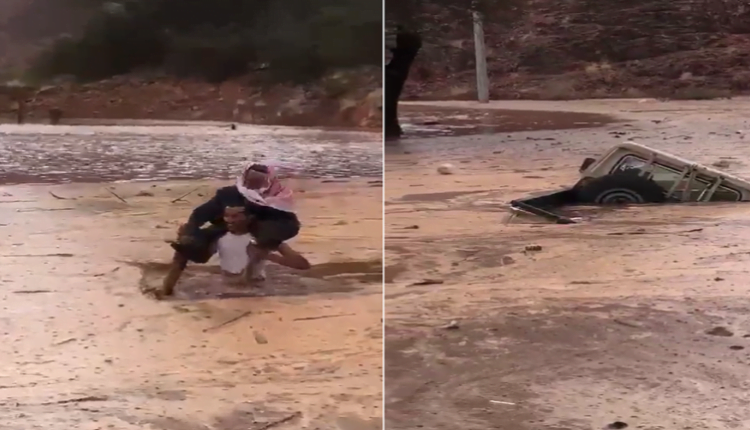 وأظهر الفيديو المواطن إبراهيم سليم الحويطي وهو ينقذ مسنا علقت سيارته في وادي “أم حمض” بمحافظة ضباء. شمال غرب المملكة، بعد هطول أمطار غزيرة تسببت بجريان الأودية والشعاب.