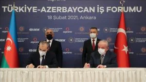 وقعت أنقرة وباكو، اليوم الخميس، 11 اتفاقية ومذكرة تفاهم بهدف التعاون المشترك بين البلدين في العديد من المجالات المختلفة، في إطار منتدى الأعمال التركي الأذربيجاني المنعقد بأنقرة.